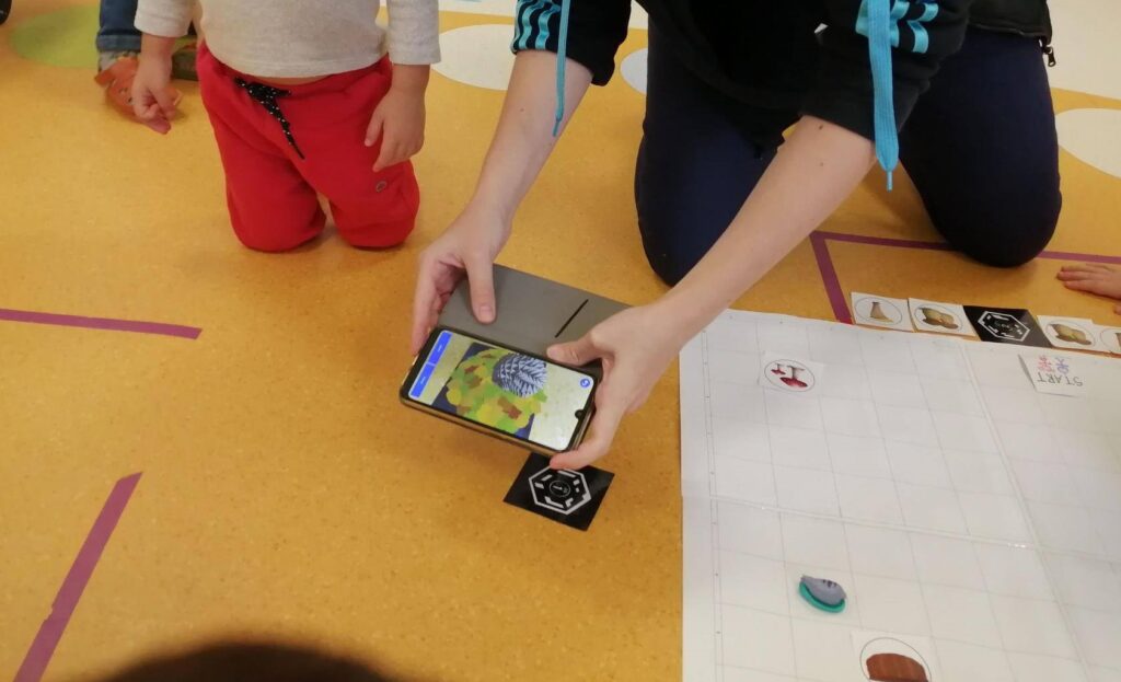 Dzieci będą rownież pracować z matą do kodowania i uczyć się tworzenia kodów oraz dekodowania zaszyfrowanych informacji. Wykorzystamy w tym celu kolorowe kubki, krążki z symbolami i znakami, kolorowe kartoniki, znaki ze strzałkami, literami i cyframi, a także puzzle AR (rozszerzonej rzeczywistości), które są bardzo atrakcyjne dla  najmłodszych.