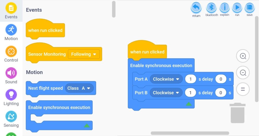 Aplikacja działa na bazie języka Scratch. Dzieci tworzą program i obserwują jej działanie w czasie rzeczywistym. Robot wykonuje polecenia ruchowe, wydaje dźwięki, korzysta z czujników koloru czy czujników ruchu.